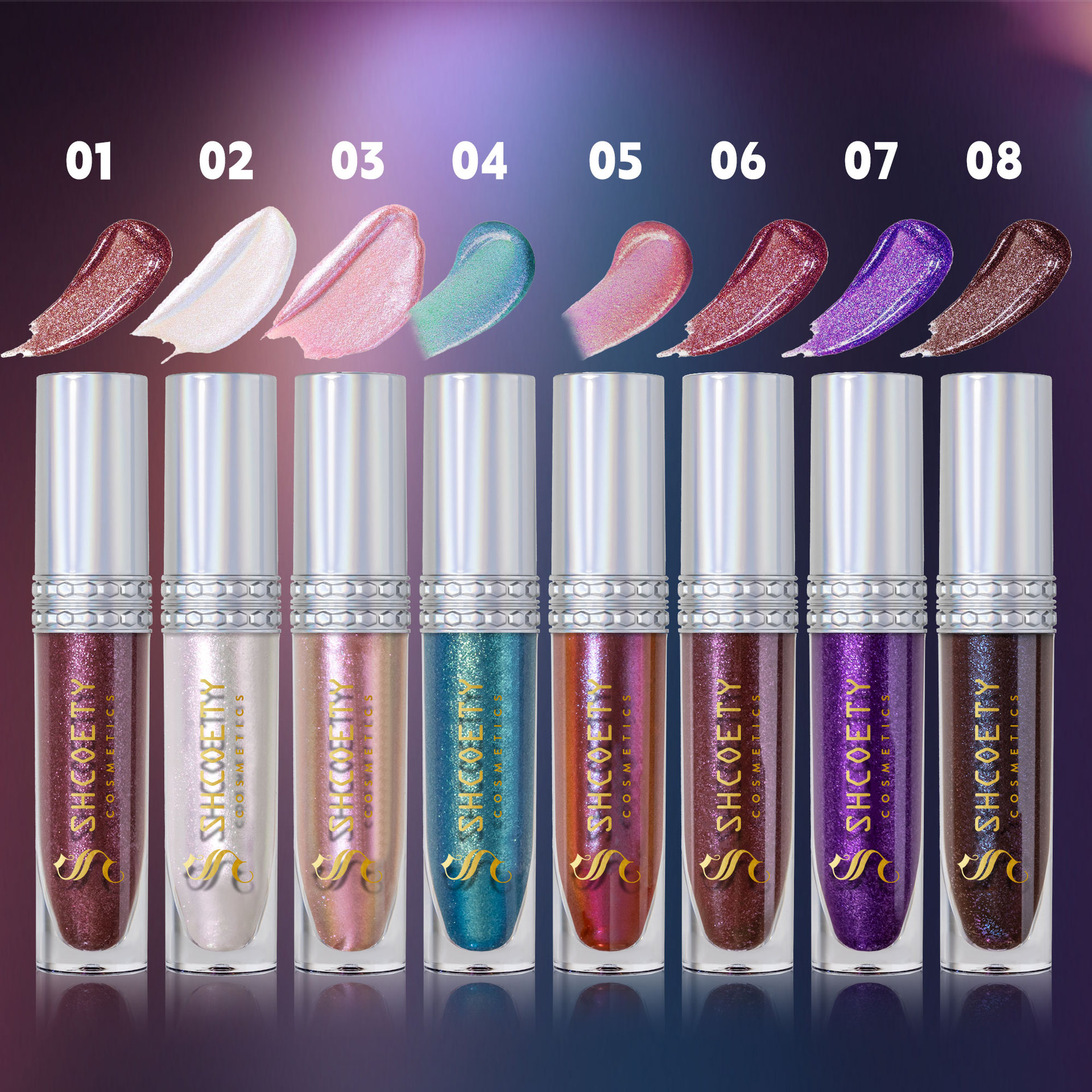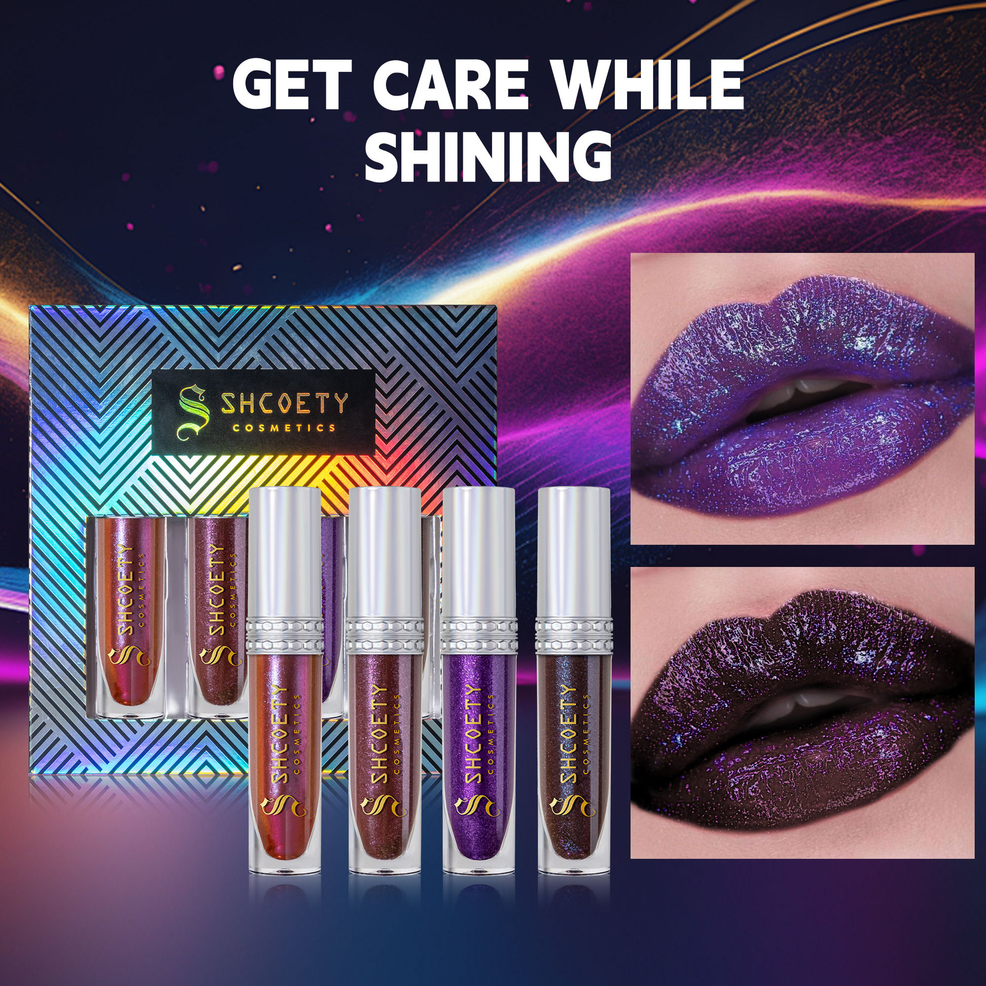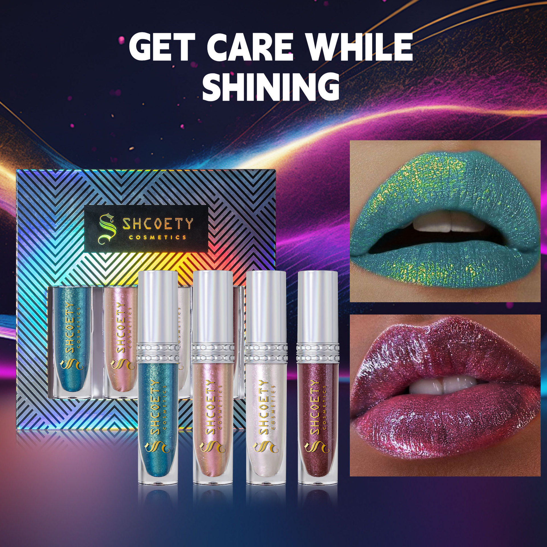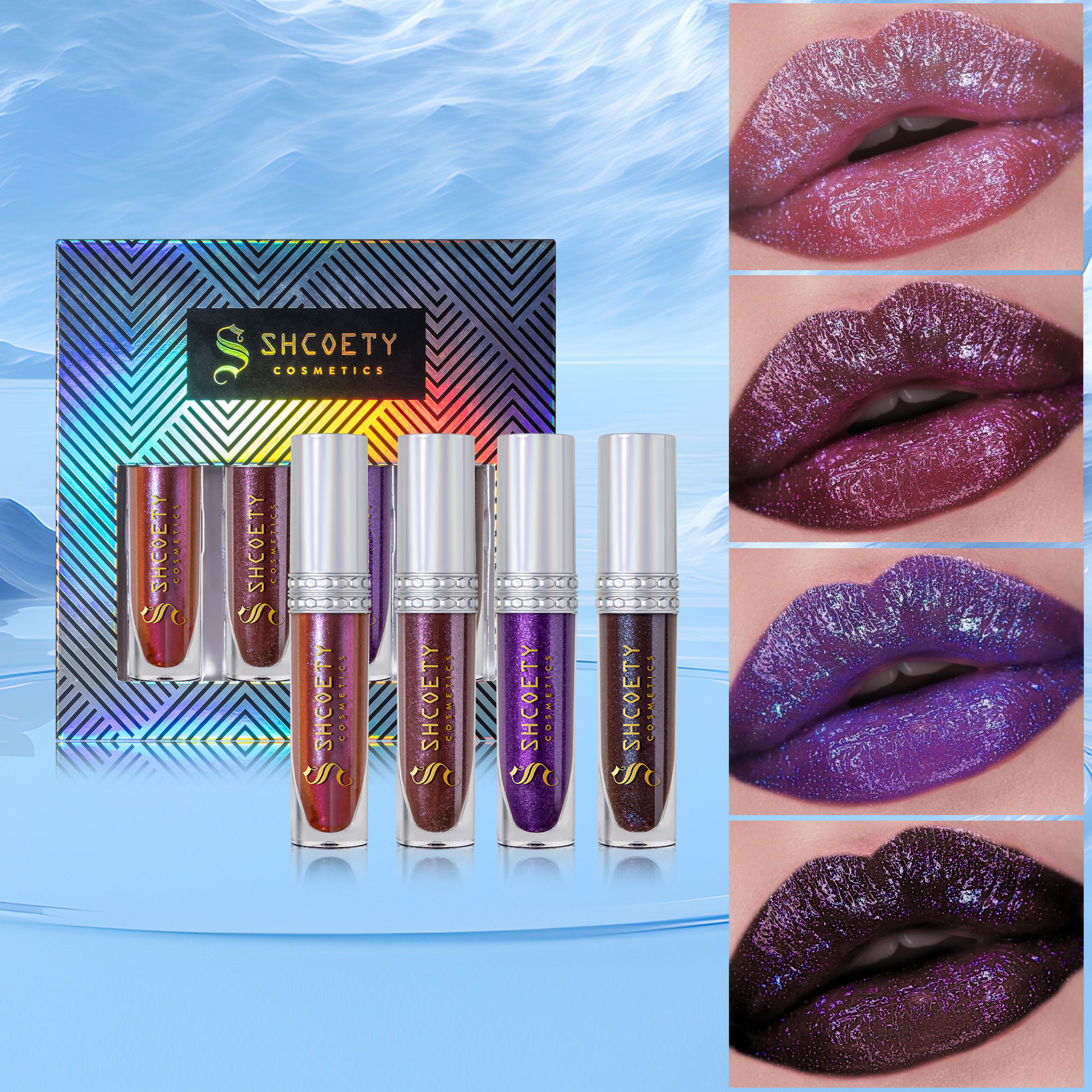 SHCOETY4支装偏光唇釉套装爆闪持久易上色炫彩唇蜜珠光细闪保湿唇